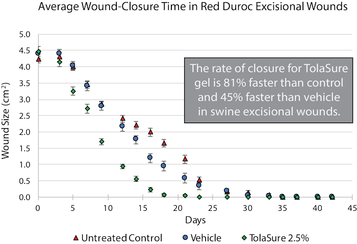 Unlike traditional wound care products that target a specific phase of the healing process TolaSure targets keystone signaling pathways that interact at each stage of the wound healing process from inflammation to remodeling. The faster healing rates seen in preclinical and clinical studies are attributed to this multipronged approach of reduction of inflammation, increase in cell proliferation, reduced scarring and protection from bacterial infection.